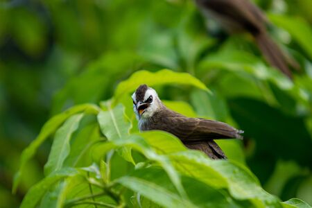 Beautiful little Yellow-Vented Bulbul enjoying with a rain drop on the mango tree close up. Colorful small bird in tropical zone. Wildlife animal concept.