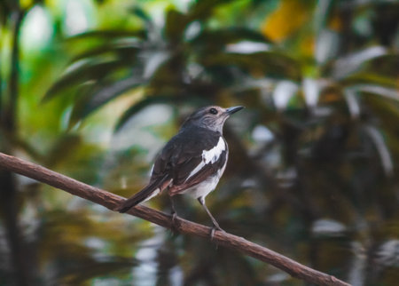 A bird sitting on a branch. Early in the morning, the bird sits on a beautiful branch on a green background of tree leaves. The sun beautifully illuminates the model