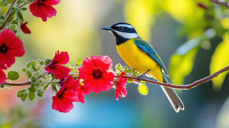 Vibrant Colorful Bird Perched on a Blooming Branch, Spring Nature Scene, Wildlife Photography