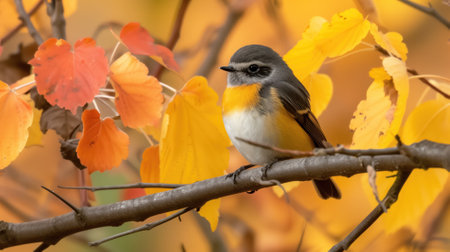 Small bird among autumn leaves