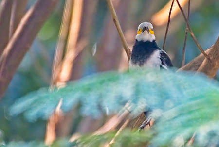 Yellow mask black eyes white and black feather bird staring face on from tree branch on tree bokae background