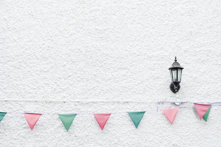 Merry Christmas Party flags bunting hanging on white wall background with wall lamp light on x'mas eve holiday event. Minimal hipster style design.