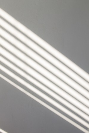 A plain light gray textured wall with a diagonal beam of sunlight casting a soft shadow from a nearby window with vertical blinds.