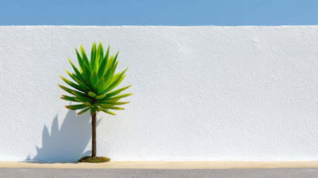 A vibrant green plant stands against a stark white wall under a clear blue sky, creating a serene and minimalist atmosphere ideal for modern design themes.