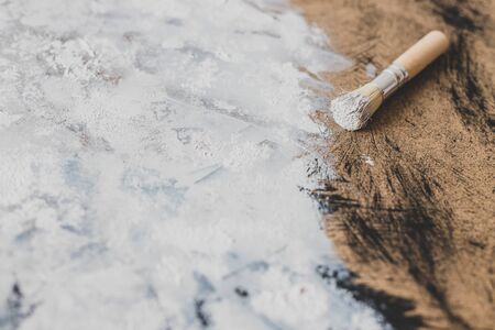 arts and diy concept, work in progress on making an abstract textured painting or photography backdrop on mdf board with paste and neutral toned acrylic paint