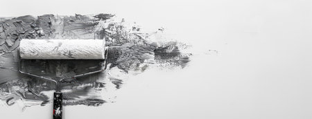 a roller painting a white wall with gray color, offering ample copy space for text, showing the skillful execution of the task