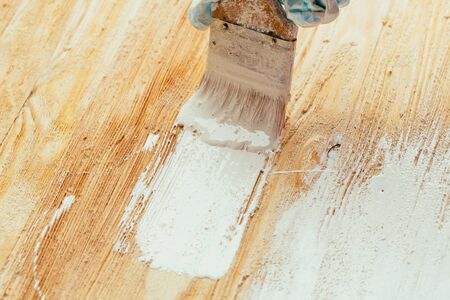 closeup hand use brush paint white on wood surface.