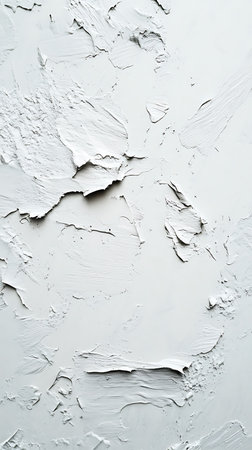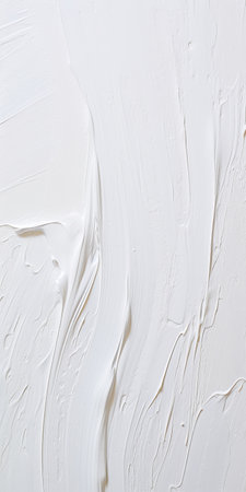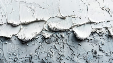 Closeup image showcases the intricate details of thick white paint strokes forming an abstract textural background. The minimalistic composition emphasizes depth and surface irregularities.