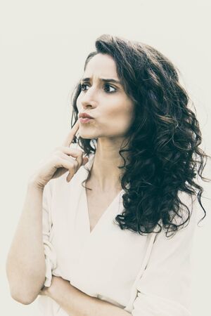 Focused pensive customer touching face with finger, looking away at copy space. Wavy haired young woman in casual shirt standing isolated over white background. Thinking or advertising concept