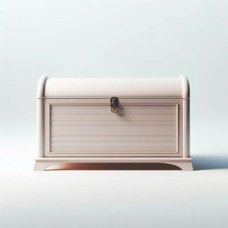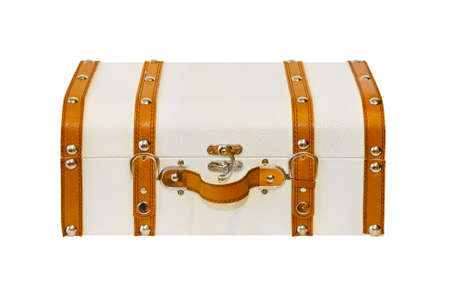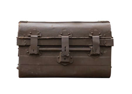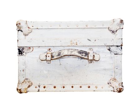 Rustic old chest isolated on white background. Wood chest is open with flaky paint chipping off and metal lock with front in burnt orange and pale yellow colors.