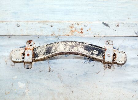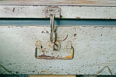 Old weathered retro vintage grunge suitcase handle and metal latch lock closeup