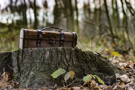 Wooden mystery box with fine beautiful carvings and decorations placed on the ground in nature with a blurred background – Small chest for storing jewelry