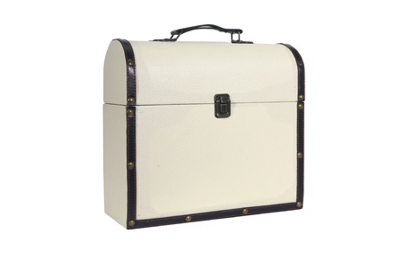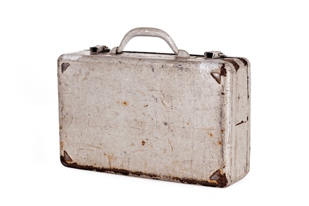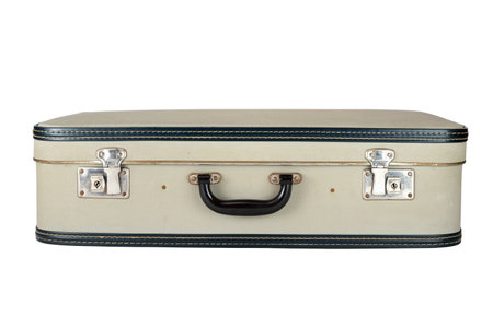 Old, retro, suitcases lie on the table with white background. Obsolete suitcase lying on the carpet