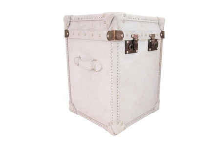 Old, retro, suitcases lie on the table with white background. Obsolete suitcase lying on the floor