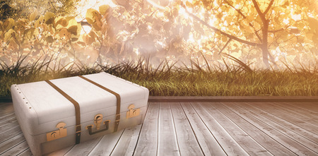 leather retro suitcase on a blurred background of nature / warm time for travel
