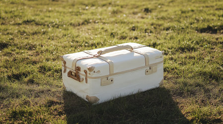 A vintage car trunk opened to reveal a vintage suitcase, evoking the sense of travel and elegance. The image highlights the blend of retro automotive design and nostalgic travel elements.