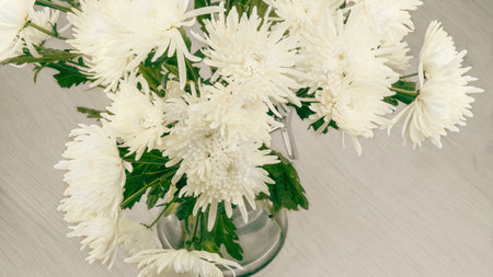 Bouquet with white chrysanthemums in a vase. From above.