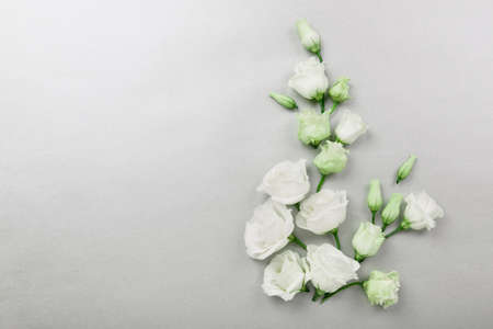 White eustoma flowers, flatlay on grey background, minimalistic colors and composition with copyspace