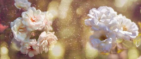 Blooming pink roses with tinted bokeh effect. Valentine's Day. Women's day. Anniversary. Festive background. Postcard. Banner