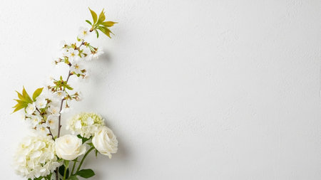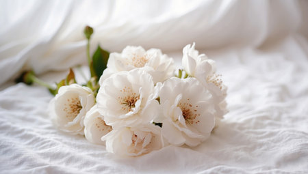 A charming arrangement of fresh white roses creates a serene and elegant display on a minimalist background, perfect for various occasions and themes.