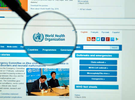 MONTREAL, CANADA - MARCH 8, 2016 - World Health Organisation logo and web site under magnifying glass. The World Health Organization is a specialized agency of the United Nations that is concerned with international public health.