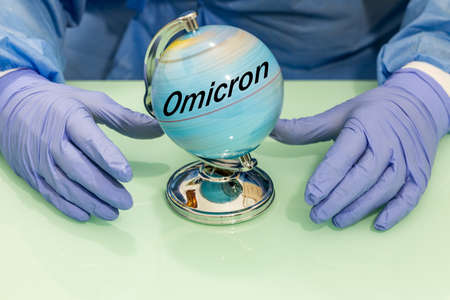A fast spinning globe with the word Omicron on it. Doctor's hands in rubber gloves, The concept of the instant spread of a new variant of the coronavirus in the world