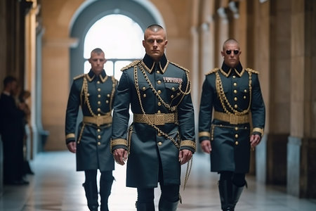 Military parade with guards in full uniform standing at attention. Concept Parade, Military, Guards, Uniform, Attention