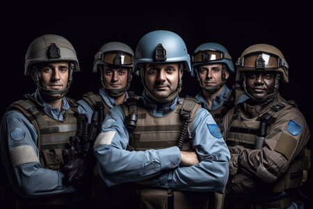 A united group of police officers standing shoulder to shoulder, ready to serve and protect, Smiling black female police officer talking to her colleagues, AI Generated