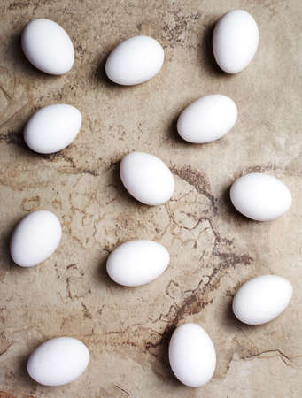 Raw chicken eggs on stone background, top view.