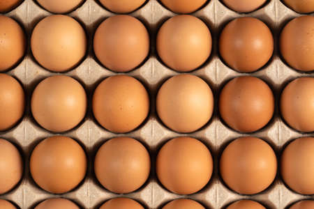 Raw chicken eggs in a cardboard tray, farm brown eggs background.
