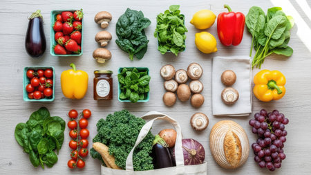 An assortment of fresh produce is arranged on a light-colored surface. The composition includes various vegetables, fruits, and bread. Colors range from vibrant reds, yellows, and greens. The overhead shot suggests an interior setting, possibly for culinary or health-related projects. It is suitable for commercial and editorial uses.