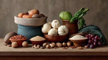 A beautifully arranged collection of fresh organic vegetables and grains showcases natural colors and textures, perfect for culinary inspiration and healthy living.
