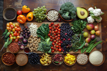 A diverse composition of nutritious food items elegantly presented in a balanced arrangement.