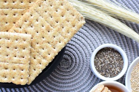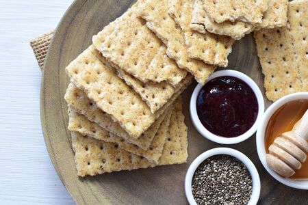 Breakfast serving of cream crackers. Selective focus points. Blurred background