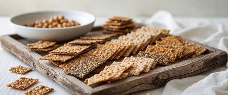 AI Generated. Crispy sorghum and chickpea crackers on wooden tray with bowl nearby