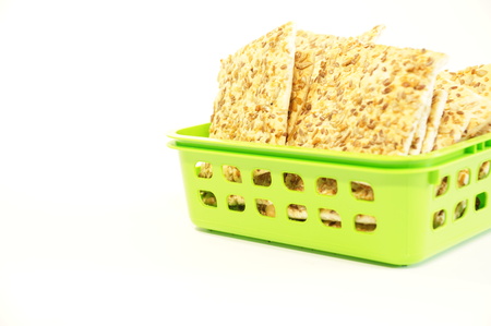 airtight container with multigrain and multiseeds crackers in tidy lines, concept of simple natural healthy ingredients and organising your pantry