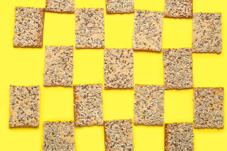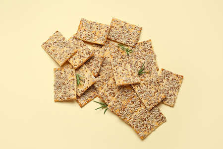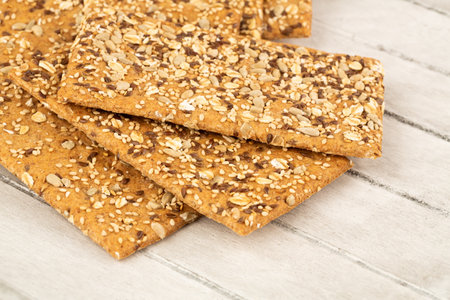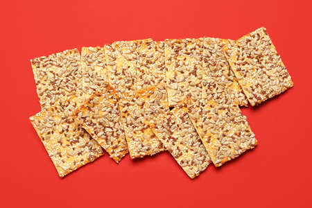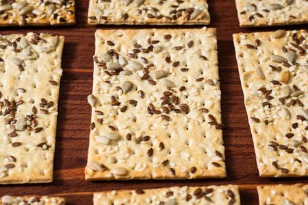 Multigrain crunchy crispbread on a dark concrete background. Healthy snack, multigrain cookies stack with seeds.