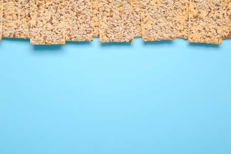 Healthy snack: cereal crunchy multigrain cereal flax seed, sesame, sunflower seeds protein bread bar. Protein albumin source.