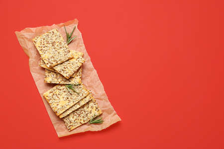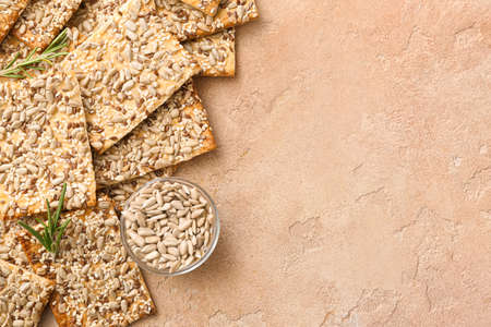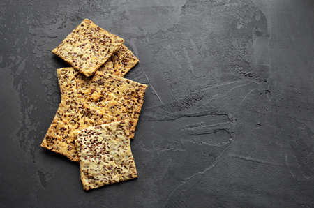 Crunchy crispbread on a dark concrete background. Healthy snack, cereal multigrain crunchy with flax seed, sesame and sunflower seeds. Top view, copy space.