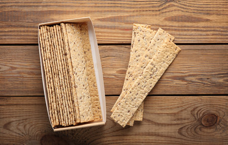 Crispbread crackers arranged on a rustic wooden background, illustrating concepts of healthy food, fiber, and wholesome diet snacks