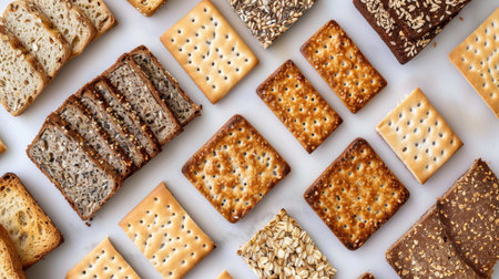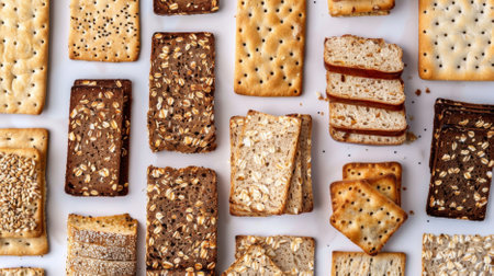 Varieties of flatbread and whole grain toast arranged as background, AI generated