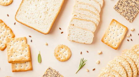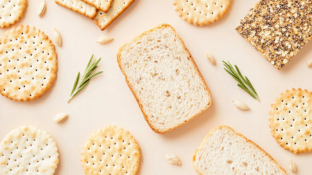 Diet breads assortment with seed loaf on pastel background, copy space, AI generated