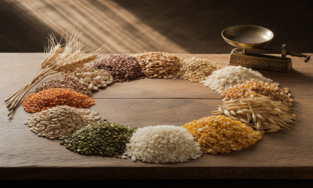 Diverse dry grains, seeds, and legumes arranged in a circular pattern on a rustic wooden table, featuring wheat, lentils, oats, rice, and an antique brass weighing scale.