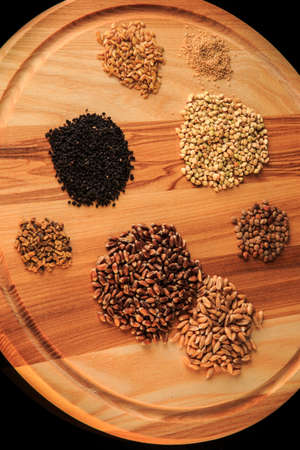 vertical view of wooden board with assorted groat handfuls flax, wheat, buckwheat, black quinoa, millet grains on black