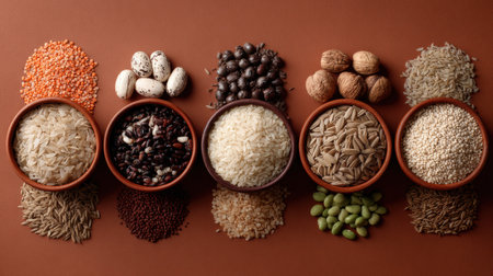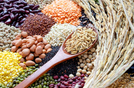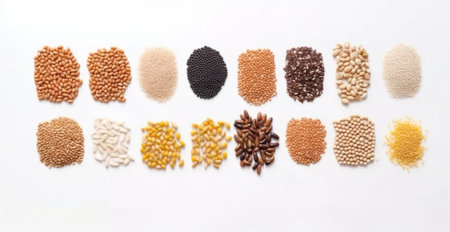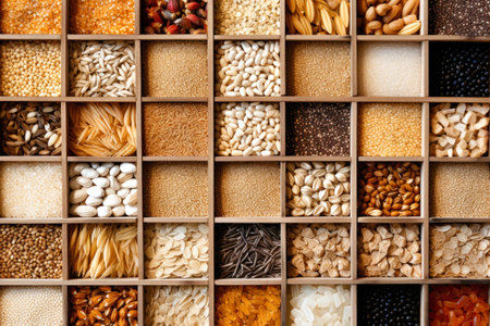 A variety of grains arranged neatly on background