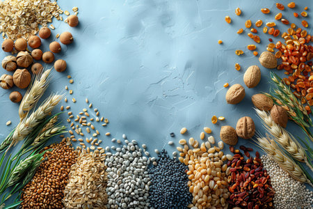 This image showcases a variety of grains and seeds artfully arranged on a blue surface, highlighting their natural textures and colors, ideal for promoting healthy eating and nutrition.
