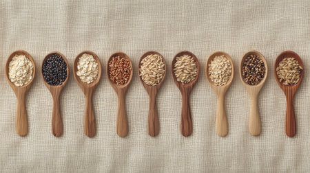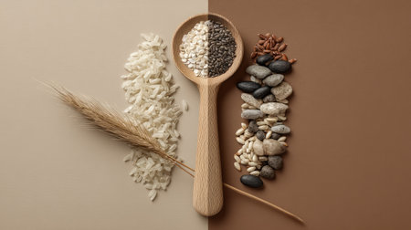 Aesthetic arrangement of various grains and seeds displayed in natural tones, utilizing a wooden spoon on an earthy backdrop, symbolizing healthy eating.