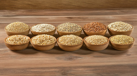 Variety of whole grains like quinoa, barley, and oats arranged in small bowls on a rustic wooden table, showing rich textures and earthy tones