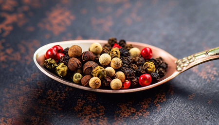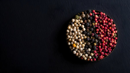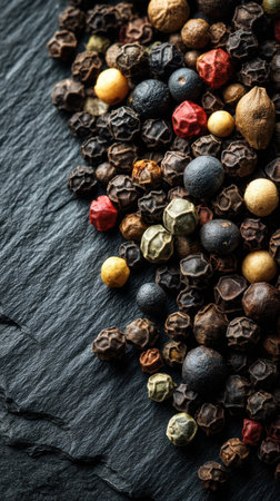 AI Generated. Colorful peppercorns resting on dark stone surface