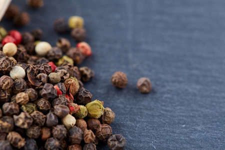 peppercorns red.Close up of Rainbow colourful peppercorns on a black slate background